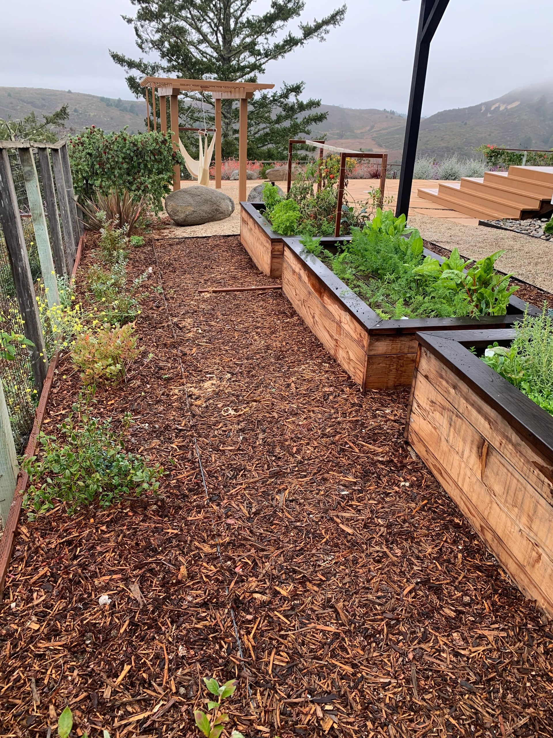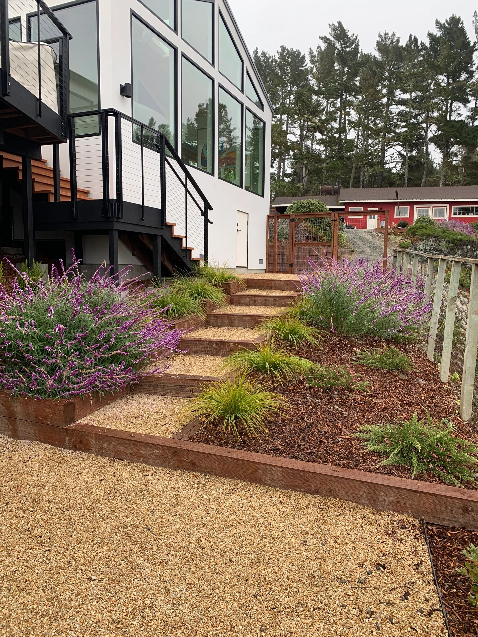 Continued crushed gold gravel pathways, hog wire fencing sprinkled with drought resistant plants.