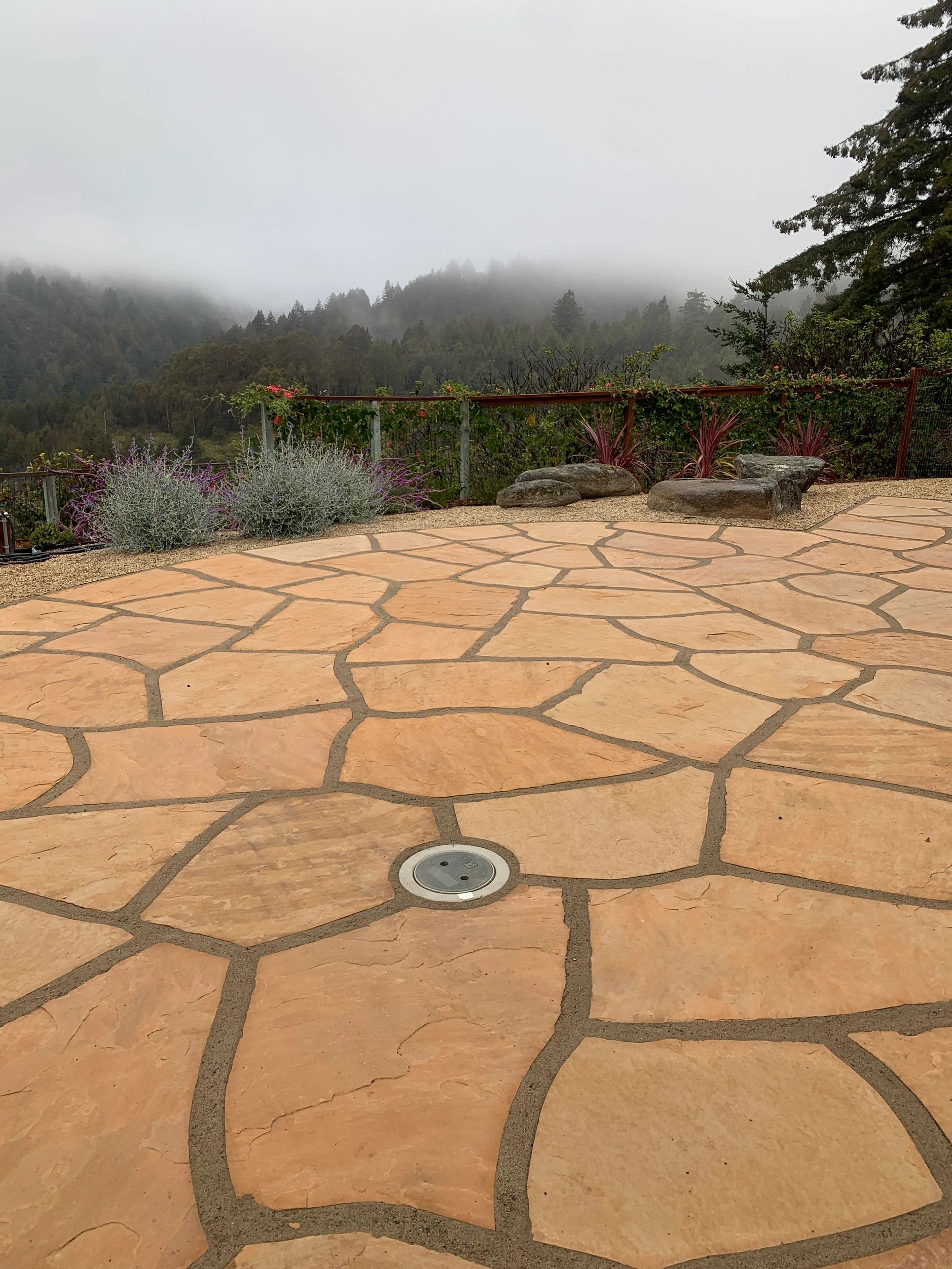 Flagstone deck area overlooking the foggy valleys of Half Moon Bay.